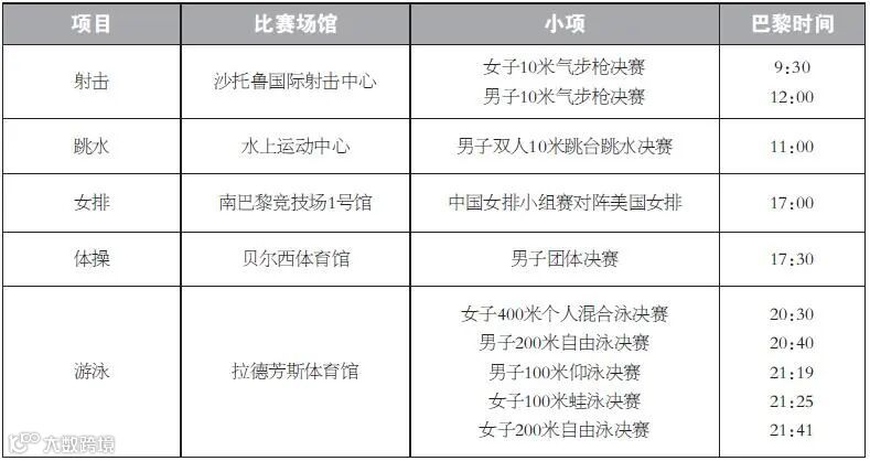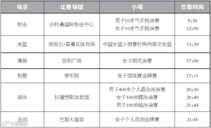 在巴黎荣军院进行的射箭比赛这一天将产生该项目首枚金牌。女子团体比赛中,杨晓蕾、李佳蔓、安琦轩组成的中国女队,将全力冲击最高领奖台。