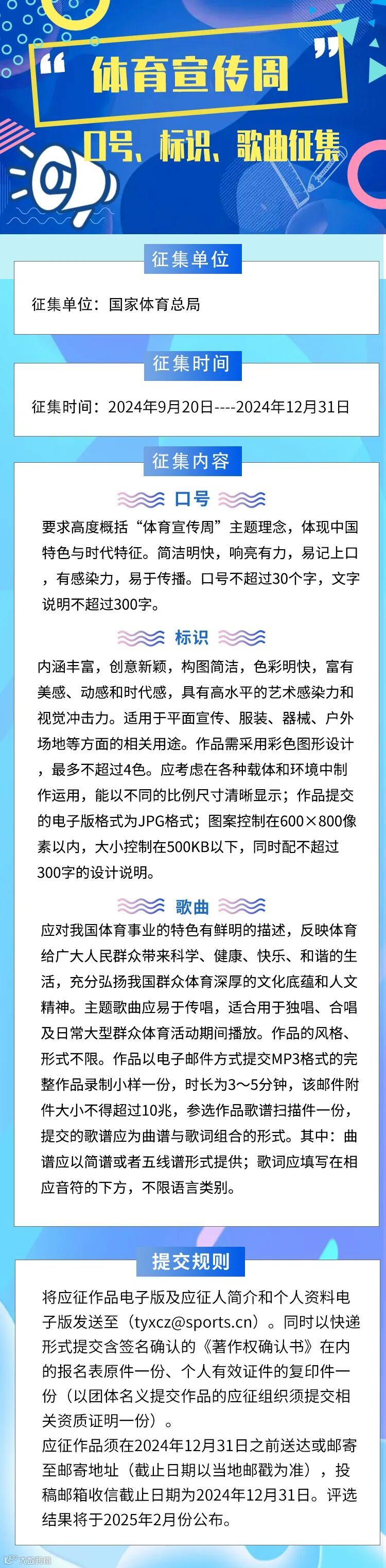 “体育宣传周”的设立,不仅彰显了国家对体育事业的高度重视,也体现了提升国民健康水平的坚定决心。体育总局现面向全社会公开征集“体育宣传周”的标识设计、主题口号及主题歌曲,旨在共同推广体育事业,营造健康的生活方式。投稿作品需具有鲜明的“体育宣传周”象征意义和感染力,力求反映我国体育事业的独特魅力,充分体现人人参与、人人受益的理念,充分展现体育为国增利、为民造福的时代要求,同时展现中国深厚的文化底蕴以及中国群众体育、民族体育独特的人文精神。作品应融合中国特色与世界潮流,风格与形式不限,但必须是原创且此前未以任何形式发表。
