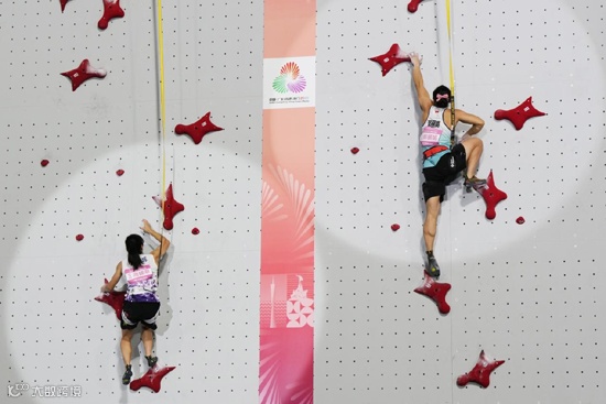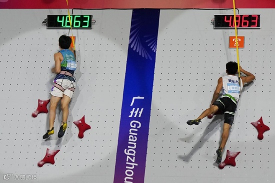 全运会速度攀岩决赛采用单回合淘汰制,选手们两两对决,获胜者晋级下一轮,晋级决赛的运动员要在1小时内进行4场比赛。这样的赛制,对于运动员的心理和体能都是一种考验,任何微小失误都可能导致出局,比赛悬念拉满。