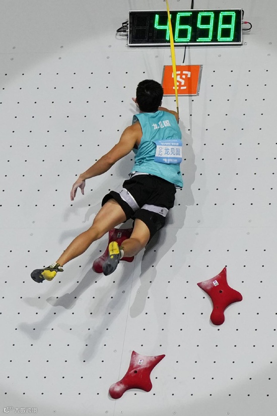 男子速度攀岩半决赛中,今年连续爬出好成绩的上海队赵一程以超亚洲纪录、创全国纪录的4秒72,淘汰今年世锦赛冠军得主、贵州选手龙见国晋级决赛。随后进行的铜牌决赛中,龙见国再次刷新最好成绩,爬出超亚洲纪录、创全国纪录的4秒69夺得铜牌。决赛中,赵一程战胜江西选手黄敬杰收获冠军。巴黎奥运会男子速度攀岩银牌得主伍鹏止步首轮。
