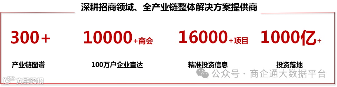 商企通大数据平台提供大数据智慧招商+大模型投资决策一站式解决方案,平台分析研究了300多个产业图谱、上下游产业链,从全国2.1亿户市场主体中精选分析出10万+上市公司(含各国家各省市各行业500强企业)的投资方向和产业布局,累积成一万多个精准有的投资能力和投资意向的投资项目信息的数据库,结合3000所高校和科研院所的2000万+科研成果和专利,联动100多家投资机构和基金公司,为地方政府强链补链招商引智助力。