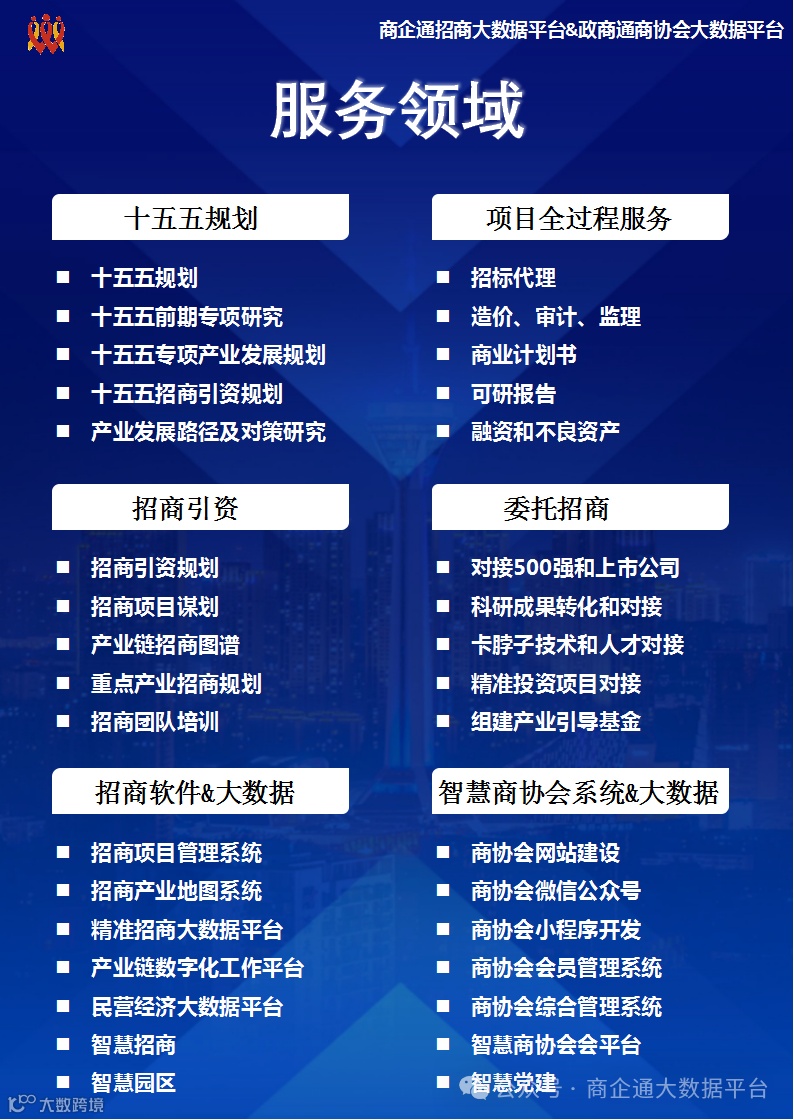 商企通大数据平台提供大数据智慧招商+大模型投资决策一站式解决方案,平台分析研究了300多个产业图谱、上下游产业链,从全国2.1亿户市场主体中精选分析出10万+上市公司(含各国家各省市各行业500强企业)的投资方向和产业布局,累积成一万多个精准有的投资能力和投资意向的投资项目信息的数据库,结合3000所高校和科研院所的2000万+科研成果和专利,联动100多家投资机构和基金公司,为地方政府强链补链招商引智助力。