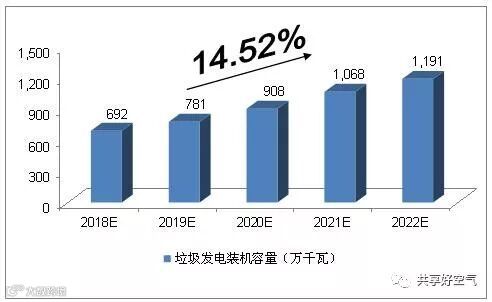 预计,2018年我国垃圾发电装机容量将达到692万千瓦,未来五年(2018-2022)年均复合增长率约为14.52%,2022年将达到1,191万千瓦。
