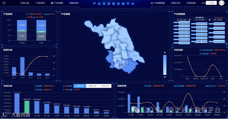 智慧化的产业高质量发展平台,基于大数据对城市经济形态进行科学明晰的分析和判定, 提升政府总揽经济全局、优化经济结构、明晰招引方向 及地区的能力。