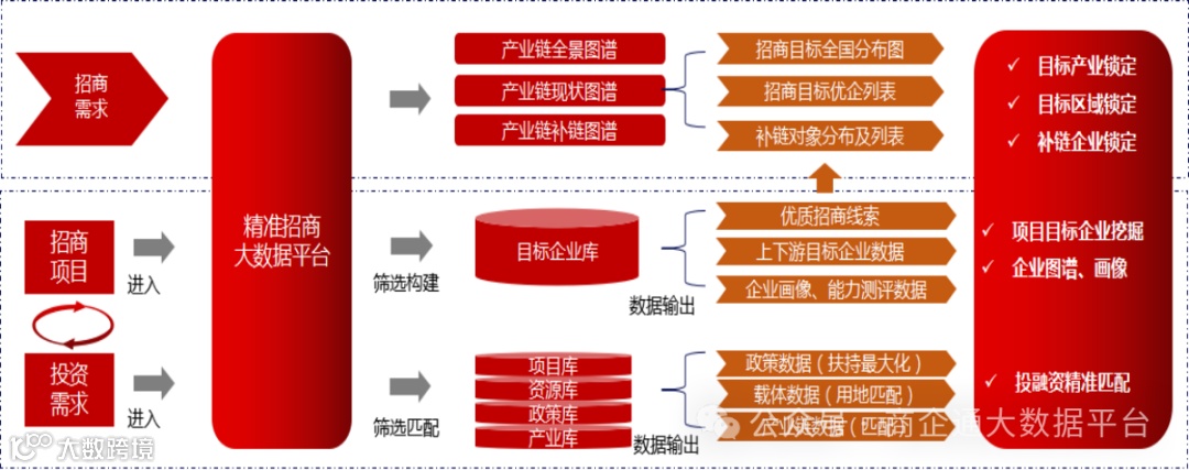 商企通大数据平台提供大数据智慧招商+大模型投资决策一站式解决方案,平台分析研究了300多个产业图谱、上下游产业链,从全国2.1亿户市场主体中精选分析出10万+上市公司(含各国家各省市各行业500强企业)的投资方向和产业布局,累积成一万多个精准有的投资能力和投资意向的投资项目信息的数据库,结合3000所高校和科研院所的2000万+科研成果和专利,联动100多家投资机构和基金公司,为地方政府强链补链招商引智助力。