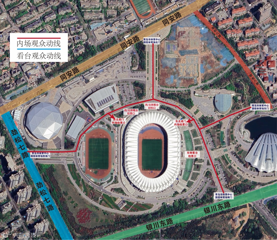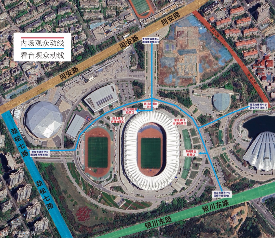 二层E、D、C、B、A、U区;四层D2、D1、C、B、A2、A1、U区的观众建议由北侧看台入口检票进入