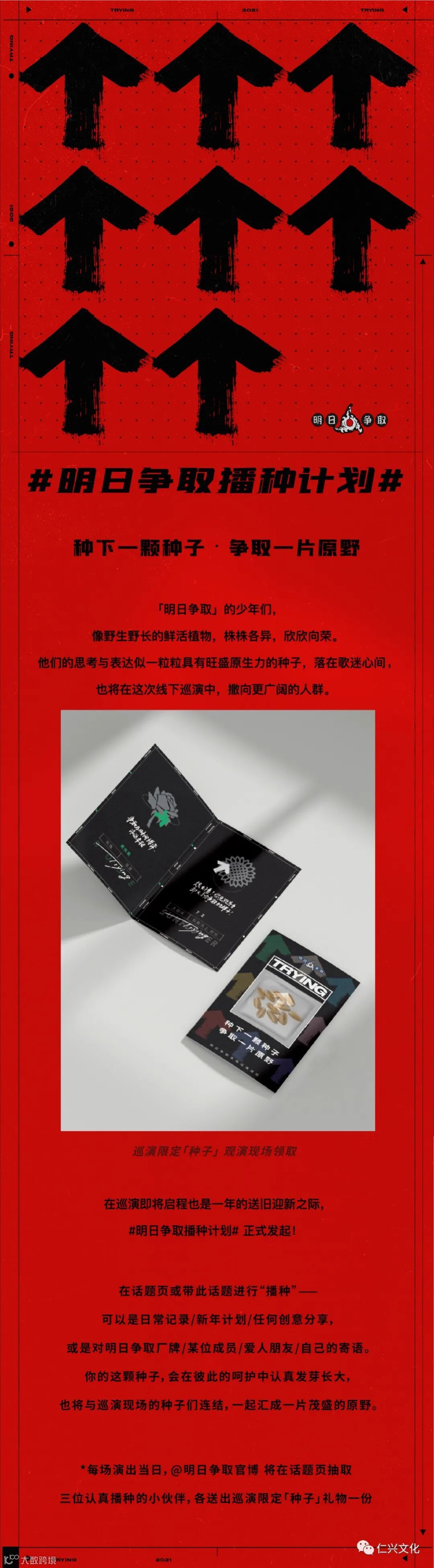 #明日争取全国巡演# 即将在12月15日于上海启程。@明日争取官博 的少年们像野生野长的各异植物,欣欣向荣,他们的思考与表达像具有旺盛原生力的种子,将在巡演中撒向更广阔的人群。🎁除了音乐种子,每位到场观众都将收到特别的种子礼物。同时#明日争取播种计划#在线上发起,来话题页“播种”,种下一颗种子,争取一片原野!与少年们的种子一起,汇成茂盛原野~🌿