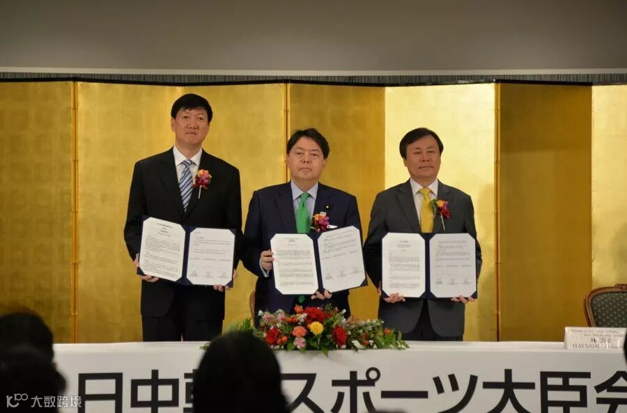中国国家体育总局副局长、中国奥委会副主席高志丹(左)与日本文部科学大臣林芳正(中)和韩国文化体育观光部长官都钟焕在签署《东京行动计划》后合影