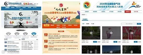 ▲全球太极拳网络大赛、全国老年人体育健身展示活动、全国健身气功网络视频系列大赛页面