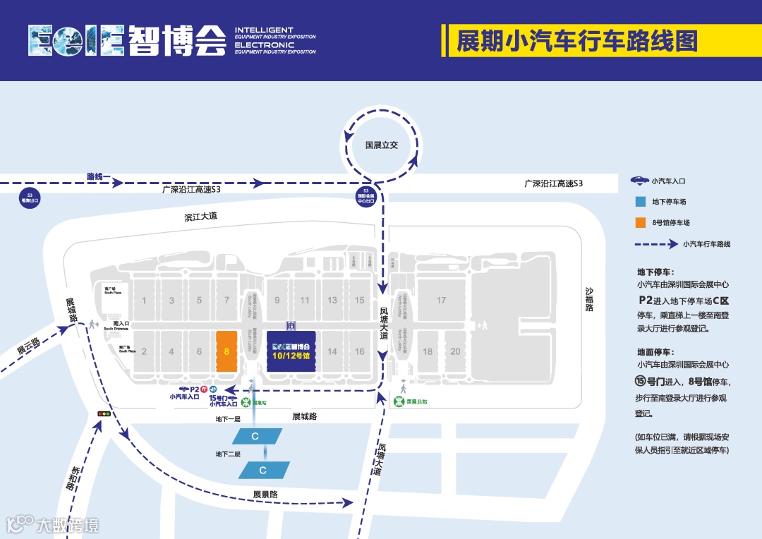 小汽车由深圳国际会展中心⑮号门进入,8号馆停车,步行至南登录大厅进行参观登记。