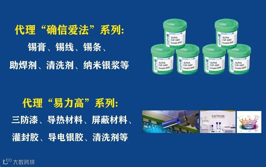 目前已代理的国外著名品牌有:Alpha(爱法)、Kester(凯斯特)、HiTech、ELECTROLUBE(易力高)等。
