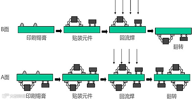 为了保证PCB板的美观和功能性,一般会采用双面贴装的方式。其中A面布置IC元器件,B面贴装元器件。