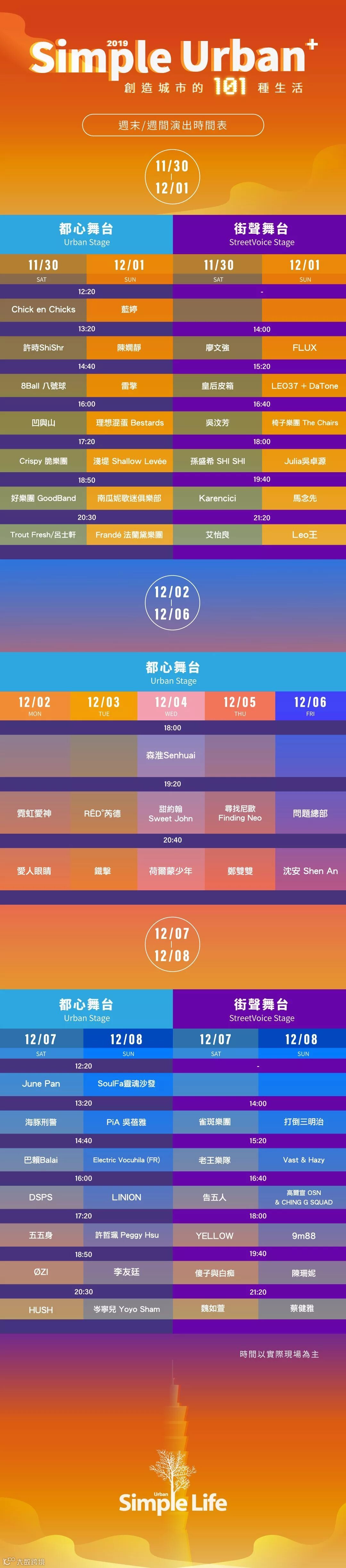 连续 9 天,横跨两个周末,台北 Simple Urban plus 汇聚新兴的音乐浪潮、大量创意品牌、前所未有的跨界提案,打造独特的都会生活场景。期待观众来与我们一起为共同所属的都市,创造更多的生活可能性,听见、看见更多身边的年轻创意能量。