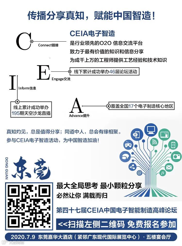 真知灼见,总是值得分享;同道中人,总会有缘相聚。CEIA电子智造始终致力于将有价值的知识和信息提供给电子制造业内的每一位同仁,7月9日,我们东莞见!