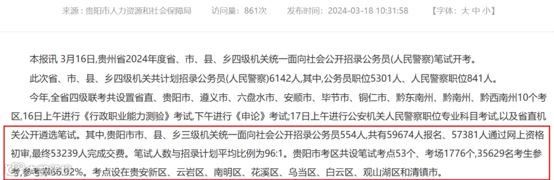 2024年,贵阳市招录公务员554人,共59674人报名,最终53239人完成交费,笔试当天35629名考生走进考场,参考率为66.92%,笔试人数与招录计划平均比例为96:1。