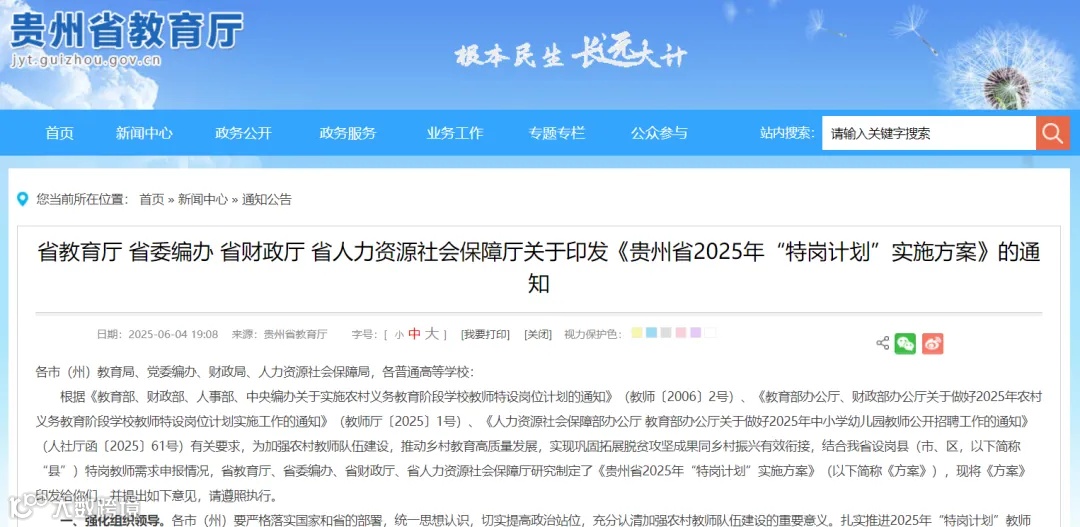 2025年全省计划招聘“特岗计划”教师3173名。其中,中央“特岗计划”3097名,用于招聘农村初中、小学教师;地方“特岗计划”76名,用于招聘农村幼儿园教师。具体各设岗县分学科岗位招聘计划详见《贵州省2025年特岗教师招聘计划表》。