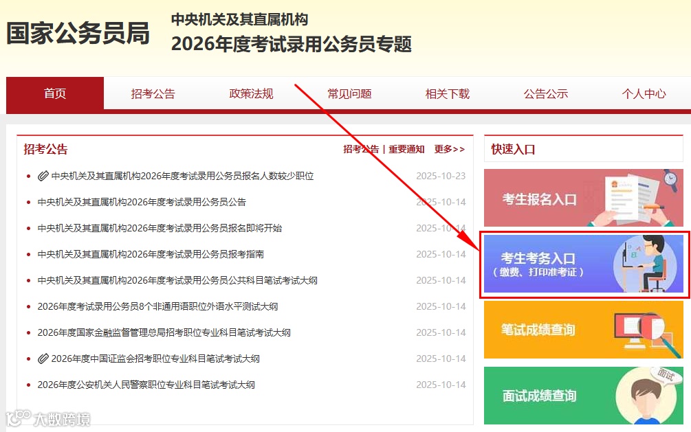 报名序号是报考人员报名确认和上网打印准考证的关键号码,务必牢记。通过资格审查的报考人员可在2025年10月28日8:00后凭本人身份证号和注册密码登录专题网站考生报名入口查询自己的报名序号。