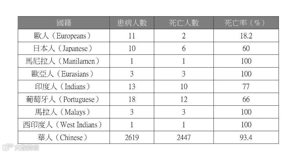 雖然港府即時推行控制鼠疫措施,但鼠疫患者有增無減,更由最初只有華人感染,蔓延至在港的歐洲人。5 月15日,兩名葡萄牙人死於鼠疫;及後負責逐戶檢查、薰洗工作的史路比郡輕步兵團(Shorprhine Light Infantry)團員與多名英軍也相繼染上鼠疫死亡,包括維思上尉(Captain Vesey, 不詳–1894)。鼠疫患者更包括印度人、葡萄牙人、歐洲人和日本人等,但仍以華人為主要患者(表3 – 1)。