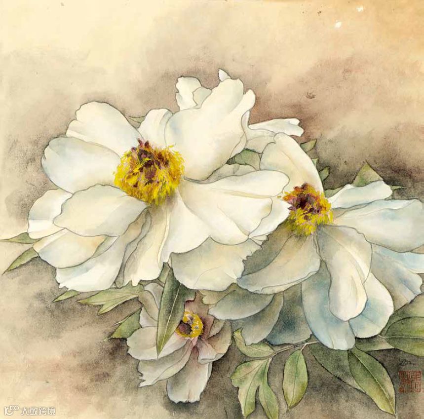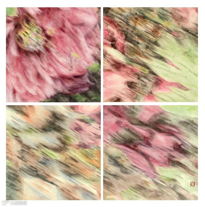 中國畫中的牡丹形象大多富貴端正,而張敏所繪之牡丹卻以空靈飄逸為神,她巧妙呈現出牡丹群在風中瞬間定格的美態,形神兼備,以氣生韻,將牡丹花神之魂在飛舞、魄在追逐的自由奔放之感表現得淋漓盡致。