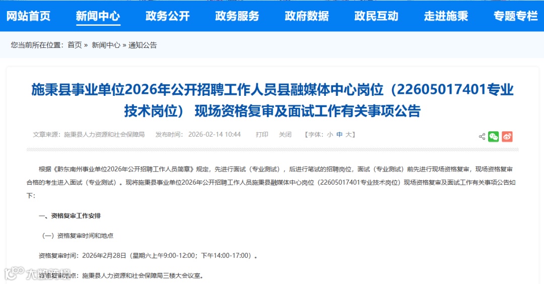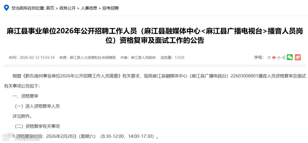 现场资格复审时间:2026年2月28日(08:30—12:00,14:00—17:00)。