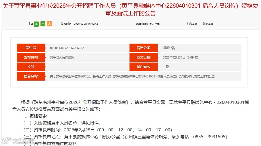 资格复审地点:黄平县融媒体中心四楼办公室(新州镇三里湾体育馆旁,联系电话:0855-3931595)
