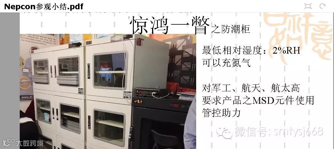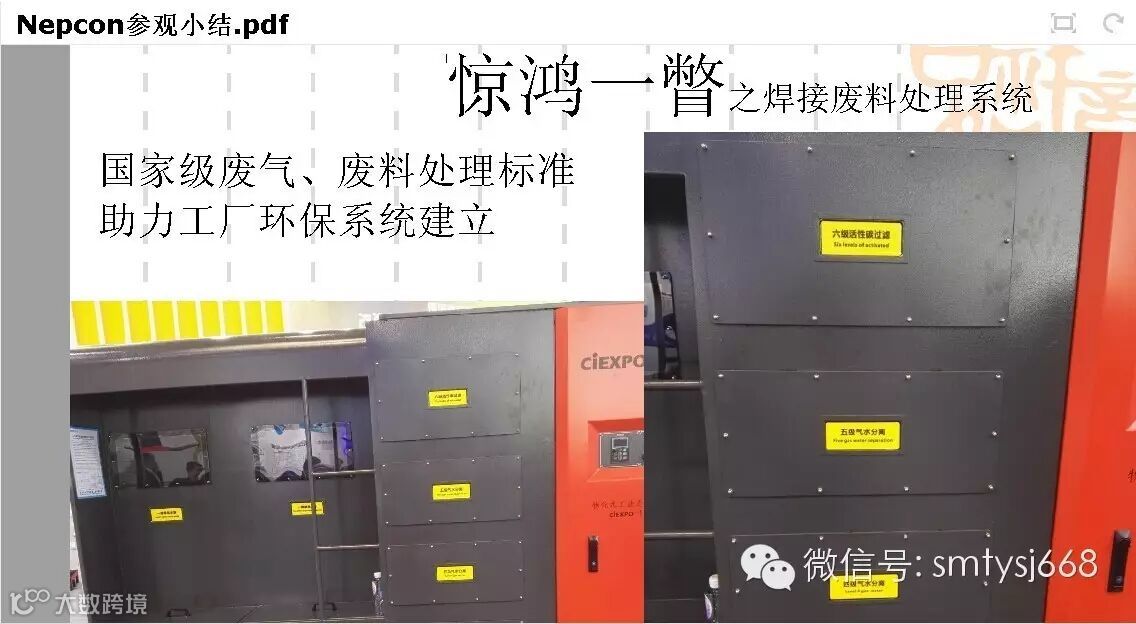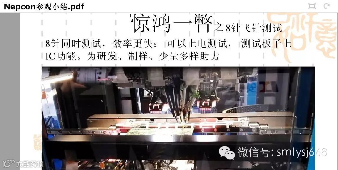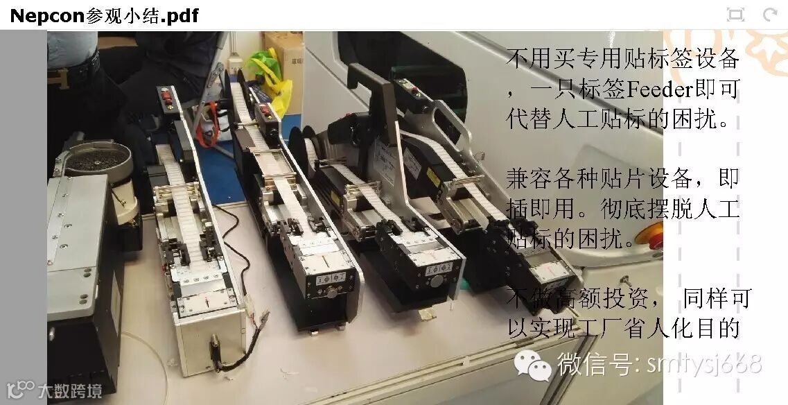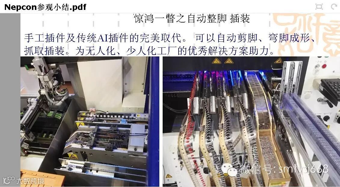 总体来说本届NEPCON展会的设备以改善为基调,不以革新为主题 ; 工厂自动化为主要线索,信息化为逻辑命脉 ; 锡膏印刷机以超精细印刷、信息互联、智慧工厂为中轴 ; 贴片机精度维持,泛用、兼容、高效为主题 少量多样贴装模式呈抬头趋势,势头迅猛; 回流焊Reflow以智慧、高端为主,强调过程管控及优化 ; 波峰焊设备发展方向以高端为主流:如氮气、超厚板 透锡高度、选择喷涂助焊剂。 选择焊市场进步明显 ; 异形元件插装、贴装话题热烈,取代传统人工插件 波峰焊接趋势明显。 工厂以无人、少人为发展主流 ; 检测设备功能精进,自动化取代人力方案成熟、市场前景明朗。 人性化、精细化取代从无到有的主题 ; 高端技术应用走下神坛, 贴近工厂应用。