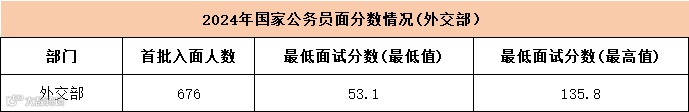 2024国考外交部首批面试名单共计676人,如图所示入面分数最高分为135.8分,最低分为53.1分。