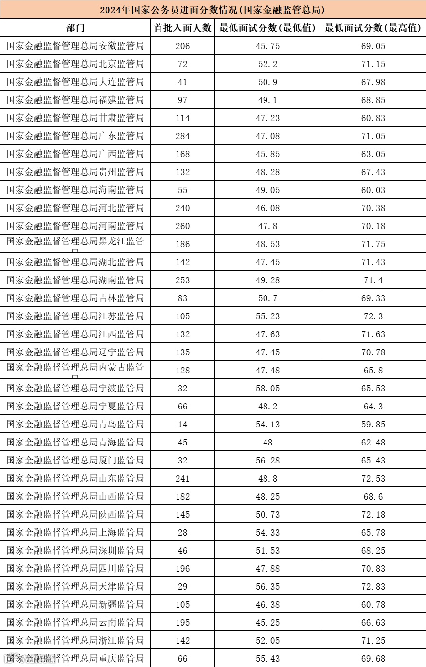 2024国考国家金融监督管理总局首批面试名单共计4397人,如图所示入面分数最高分为72.83分,最低分为45.25分。