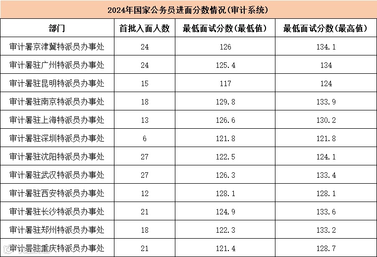 2024国考审计署首批面试名单共计226人,如图所示入面分数最高分为134.1分,最低分为117分。