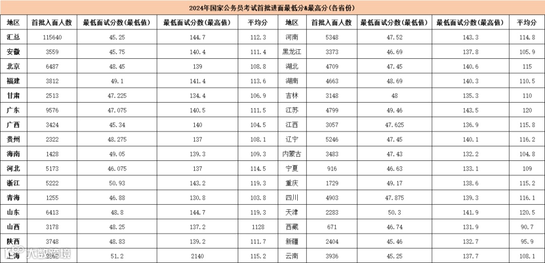 2024年国家公务员首批进面名单共计有115640人入围,平均入围分数112.3分,各省份进面平均数据如下:
