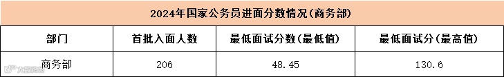 2024国考商务部首批面试名单共计206人,入面分数线最低分为48.45分,最高分为130.6分。