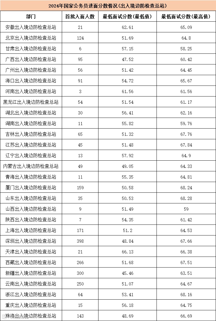 2024国考出入境边防检查总站首批面试名单共计2512人,如图所示入面分数最高分为68.28分,线最低分为45.46分。