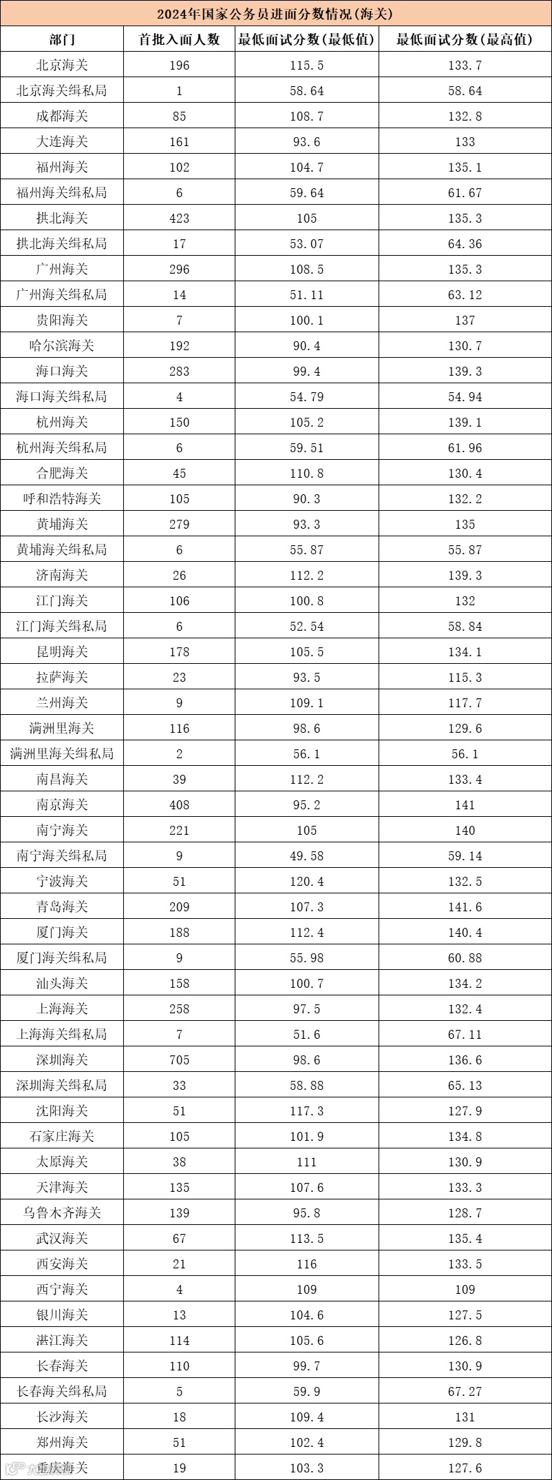 2024国考海关首批面试名单共计6029人,如图所示入面分数最高分为141.6分,最低分为49.58分。