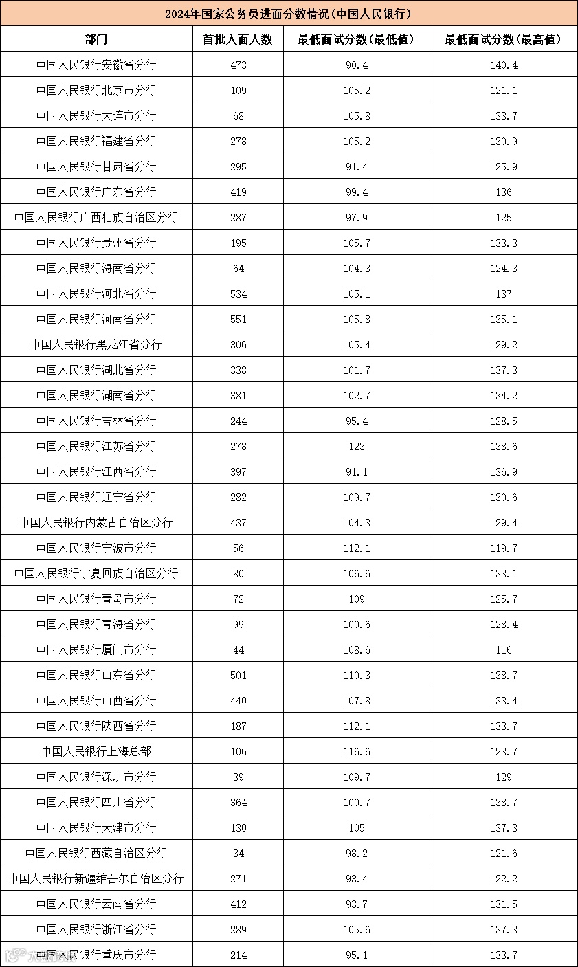 2024国考人民银行首批面试名单共计9274人,入面分数线最低分为90.4分,最高分为140.4分。