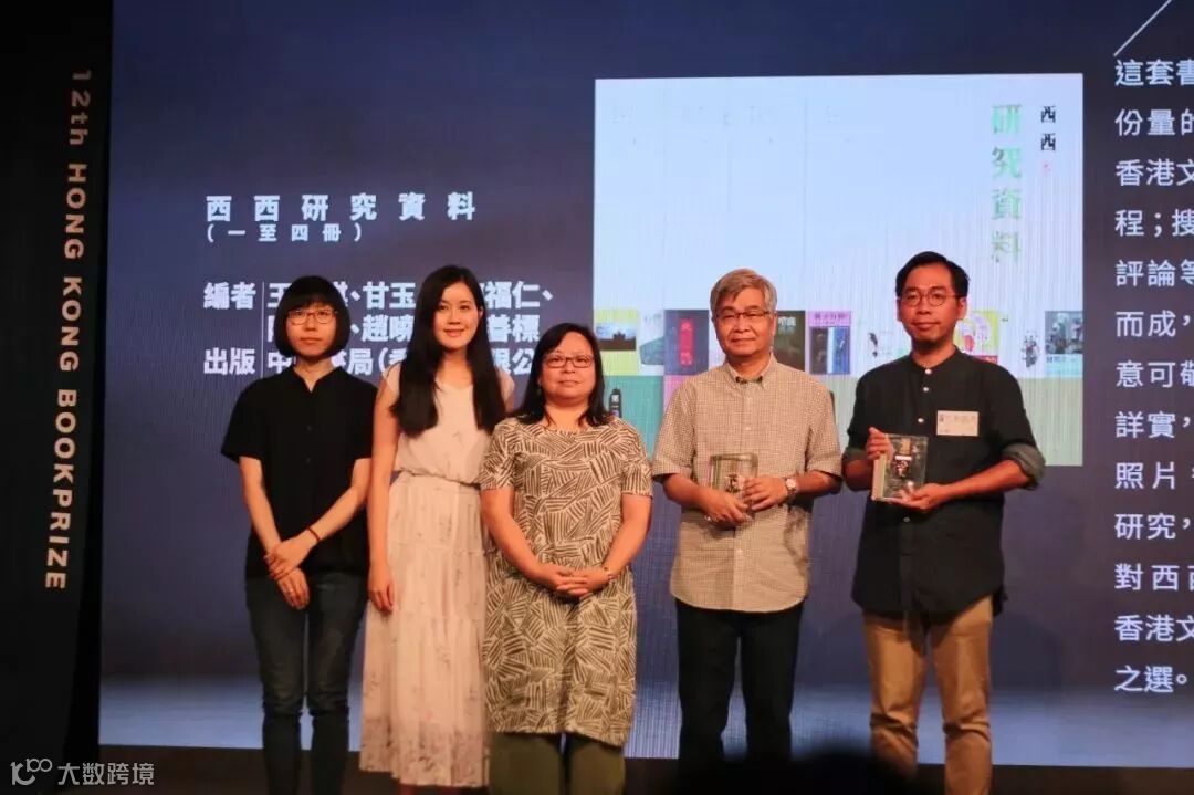 責任編輯黎耀強(左一)與兩位作者及頒獎嘉賓頒獎合影