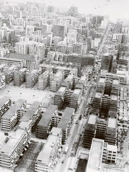 ▲石硤尾徙置區,約1969 年。正中是南昌街,左中部聖方濟各堂的前方是石硤尾街。