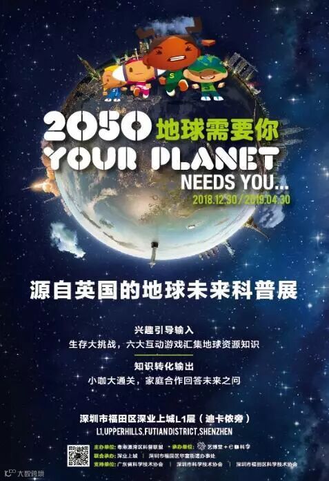 展覽簡介:源於英國國立科技館,1500㎡超熱門未來探索主題巡展,59位元科學家歷經4年研發,全球超過17個國家巡迴展出,接待超過15,000,000訪客,“2050 地球需要你”首次專業授權亞洲,在深業上城開啟首秀。1張生存卡,4個未來卡通角色,探索5大未來地球生存主題,體驗24個科技互動點,一次90分鐘科普親子出行,讓父母與孩子一起體驗未來科技的無限可能。