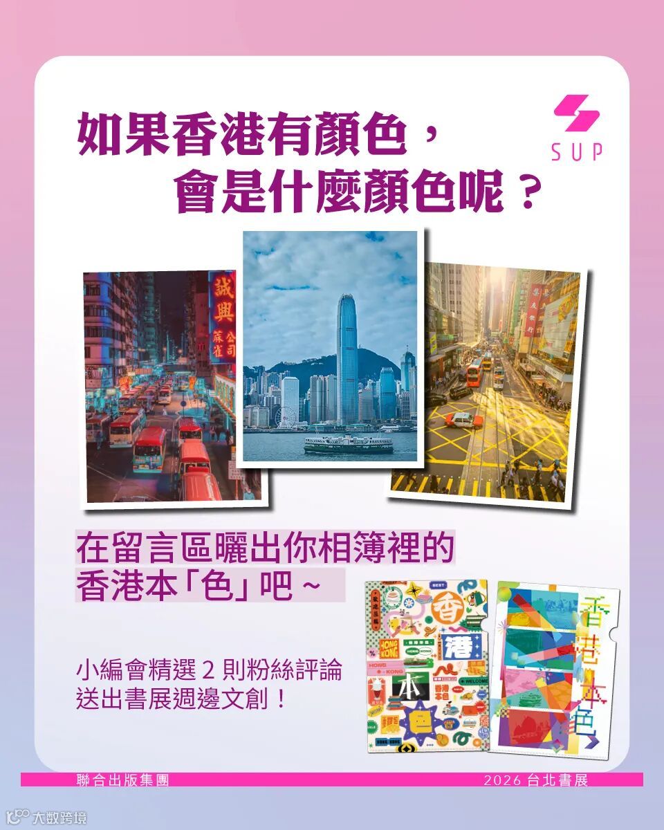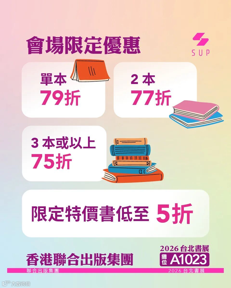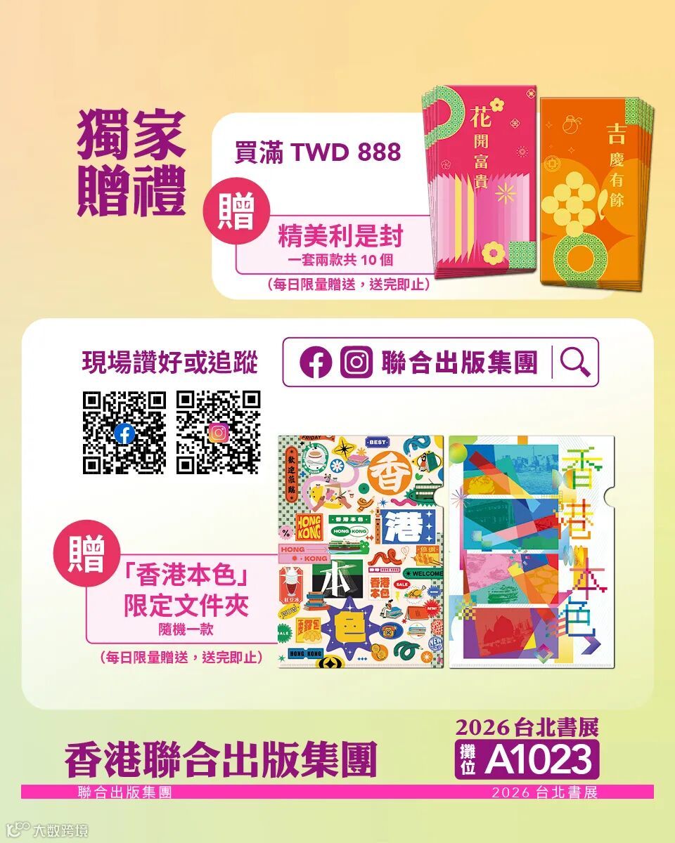 是次台北國際書展,聯合出版集團攤位全場圖書享有單本79折,2本77折,3本或以上75折優惠,還有一系列限定特價書以低至5折出售,機會難得,切勿錯過。讀者在現場購書,亦有機會獲得限定好禮,包括:凡買滿TWD888即可獲贈精美利是封一套(共10個)。現場讚好或追蹤聯合出版集團Facebook或Instagram(@sinounitedpublishing),即可獲贈「香港本色」限定文件夾。數量有限,送完即止!