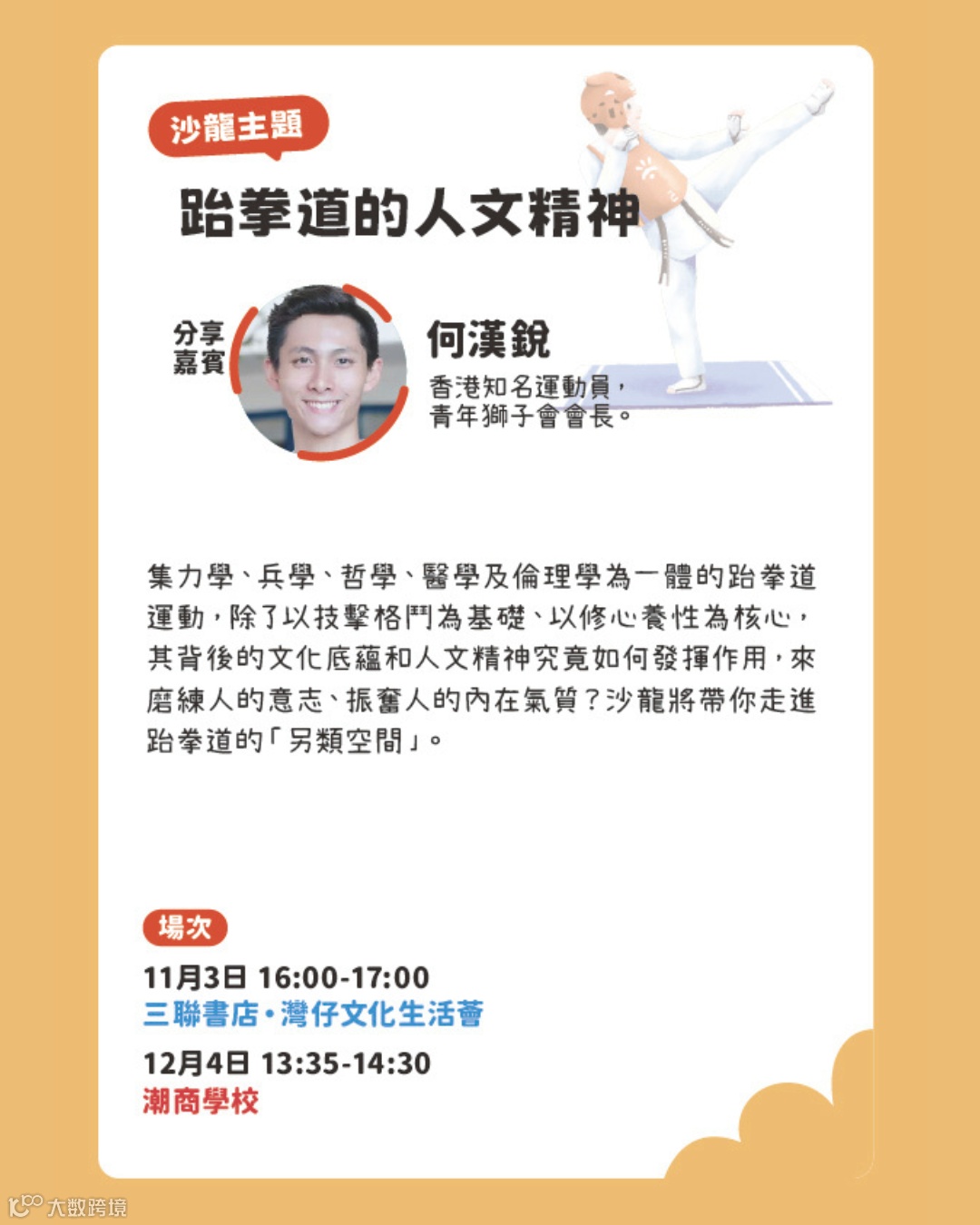 在何先生的講述中,跆拳道不僅是一門技擊格鬥的技藝,更是一門融合力學、兵學、哲學、醫學與倫理學的綜合修行。他以多維視角與親身經歷為引,娓娓道來跆拳道如何從一招一式的鍛鍊,轉化為修心養性的精神實踐。