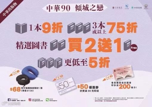 另外,讀者於優惠期間凡於中華書局購買中華出版圖書,折實滿港幣90元,即送港幣50元現金券!讀者亦可以港幣68元,換購原價港幣138元的精美頸枕一個;中華書局會員購買指定圖書,更可獲贈200積分。