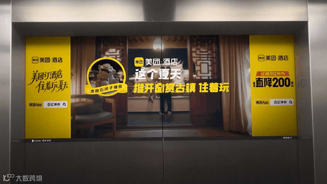 借助梯影电梯C位大屏,美团酒店精准传递「住着玩」的概念,让快乐出游,轻松出游的理念直击心智。