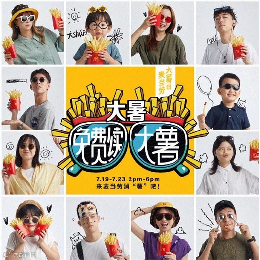 一年一度的“大薯日”,为了给大家消暑,麦当劳曾推出“戴墨镜,买大薯免费续大薯”活动。在“大薯日”活动期间,消费者只要戴上墨镜前往麦当劳门店,买大薯就可以免费续大薯。