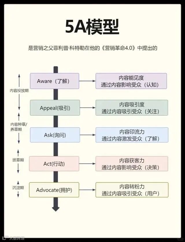 科特勒5A模型这样定义营销。它包括Aware(了解)、Appeal(吸引)、Ask(询问)、Act(行动)和Advocate(拥护)五个阶段,指导品牌与用户建立长期合作关系。