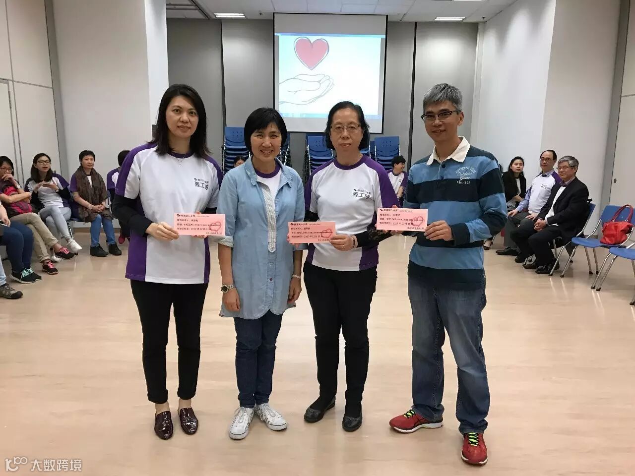 袁燕頤(右二)、何志成(右一)和吳淑賢(左一)分別榮獲「2016年最積極參與義工獎」的金、銀、銅獎,獎品金額不同,供捐款至慈善機構
