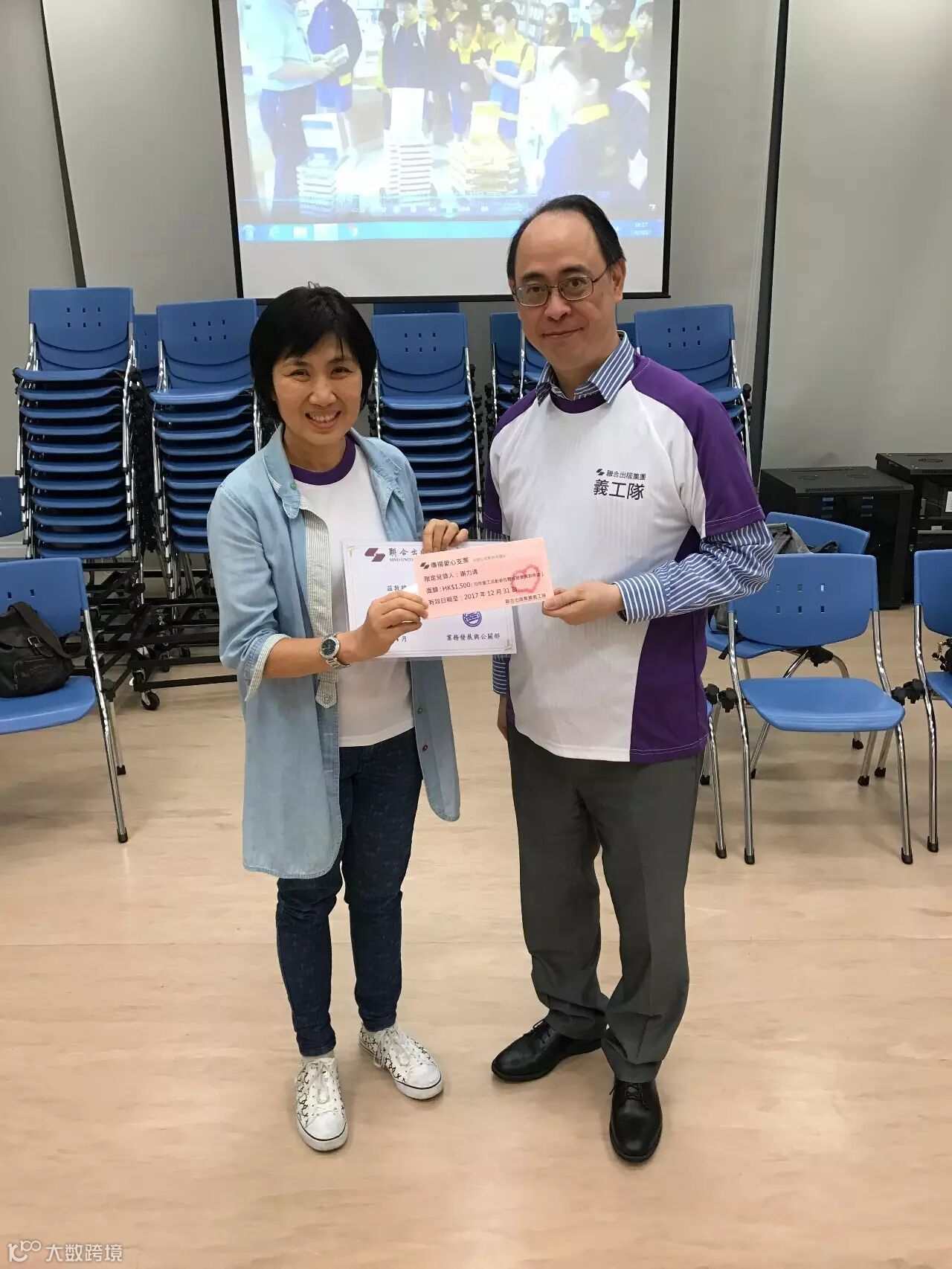 集團業務發展與公關部總經理梁榮錝(右)向義工隊前隊長謝力清(左)頒發「義工隊顧問」委任狀,同時致送金額,供捐款至慈善機構