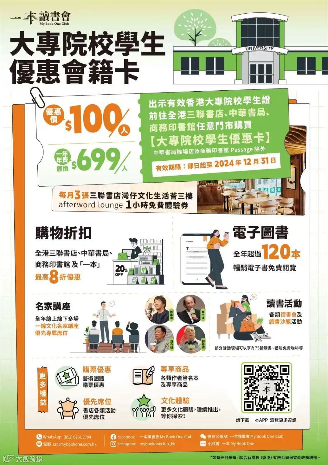 「一本讀書會」在新學期開始之際,特別推出為香港大專院校學生量身打造的專屬折扣。即日起,即可用港幣$100購買原價$699港幣的一年會籍權益。