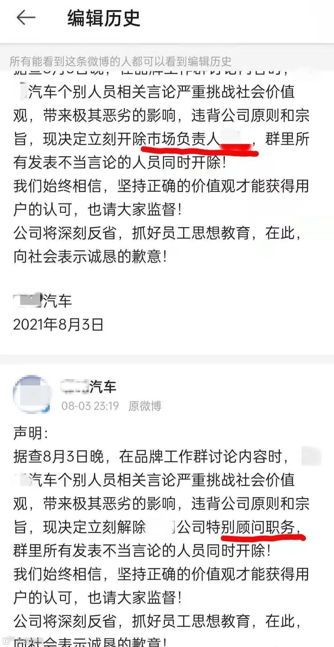 XX汽车道歉微博的编辑记录显示,当事人彭X的职务