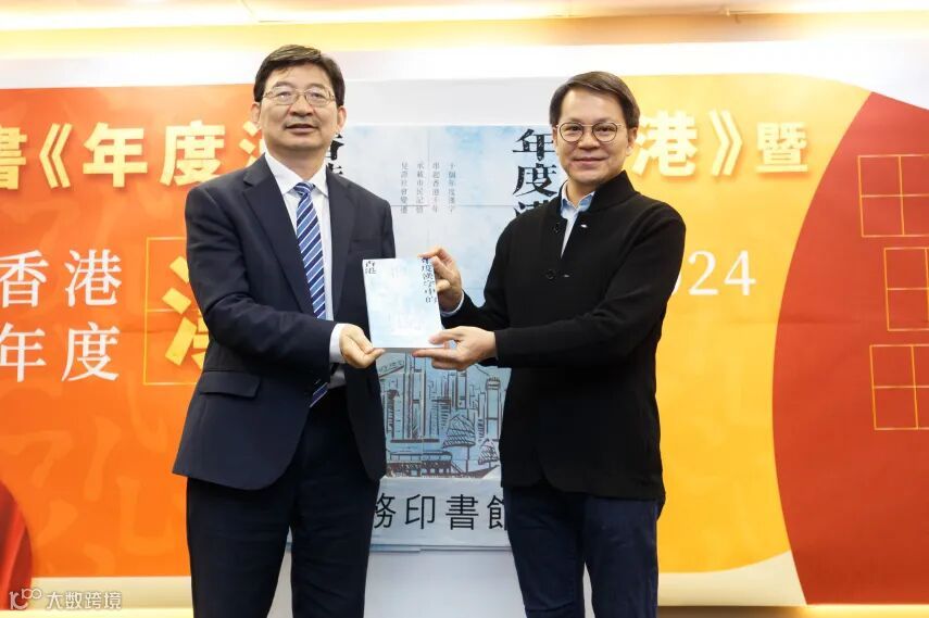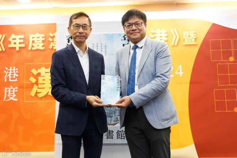 最後,傅偉中董事長、聯合出版集團副總裁兼香港商務印書館董事長李家駒、香港商務印書館總經理兼總編輯毛永波,分別向教聯會秘書長崔劍、東華三院高級教育服務主任黃子峰、民建聯主席陳克勤,贈送《年度漢字中的香港》一書,寓意代表新書進入社區,普及港情教育。