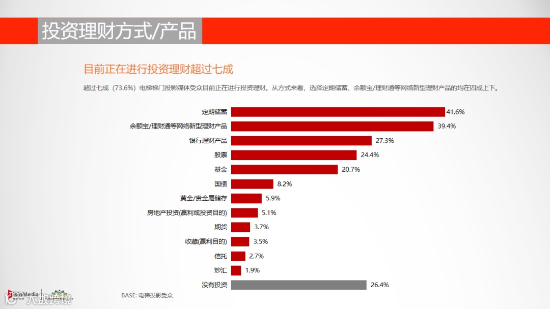 吾德研究数据显示,超过七成(73.6%)电梯梯门投影媒体受众目前正在进行投资理财。从方式来看,选择定期储蓄、余额宝/理财通等网络新型理财产品的均在四成上下。