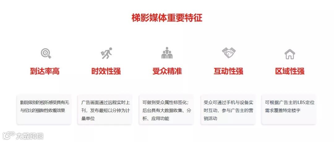 据悉,梯影媒体展现位置是电梯场景下唯一封闭空间内正面直视的区域,拥有超高媒体到达率。又因其高清巨幕加上有声流媒体视频等“影院”级别视听特征,使媒体关注度、购买驱动等效果指标均优于竞品,成为广告主建立消费者第一品牌联想度的首选媒体。